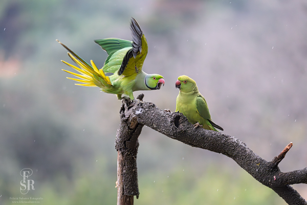 Cotorra de Kramer (Psittacula krameri) El macho adulto presenta un collar negro y una nuca rosada, mientras que la hembra tiene el collar más tenue o ausente. Es originaria de África y Asia, pero ha formado poblaciones asilvestradas en ciudades de todo el mundo, incluyendo Europa y Norteamérica.